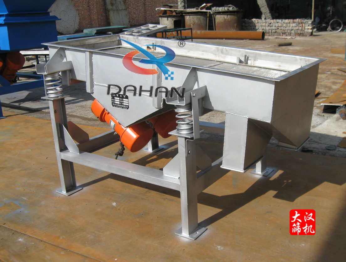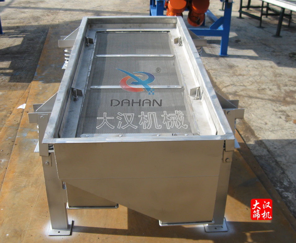 “大漢牌”DZSF-512-1S食品直線振動篩篩面寬為50mm,長1200mm,一層篩網二出口,與物料接觸部材質以及直線篩篩網均為304不銹鋼,內部打磨拋光,干凈衛(wèi)生,支架以及電機板、導力板為Q235碳鋼材質,噴防銹漆。